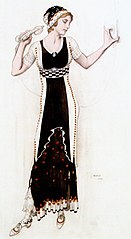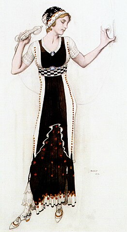 English: Léon Bakst as fashion designer -- he combines elements of 1912 styles (when a trend towards straight narrow skirts was displacing the brief hobble-skirt fad) with elements of the old Empire silhouette -- posed against modern new-fangled technological gadgetry. The draping of the bottom hems of the upper and lower skirts is influenced by ancient Greek women's attire, while the little ankle-vent would have been considered moderately racy and intriguingly unusual by the standards of 1912, while not being actually indecent for indoors wear.