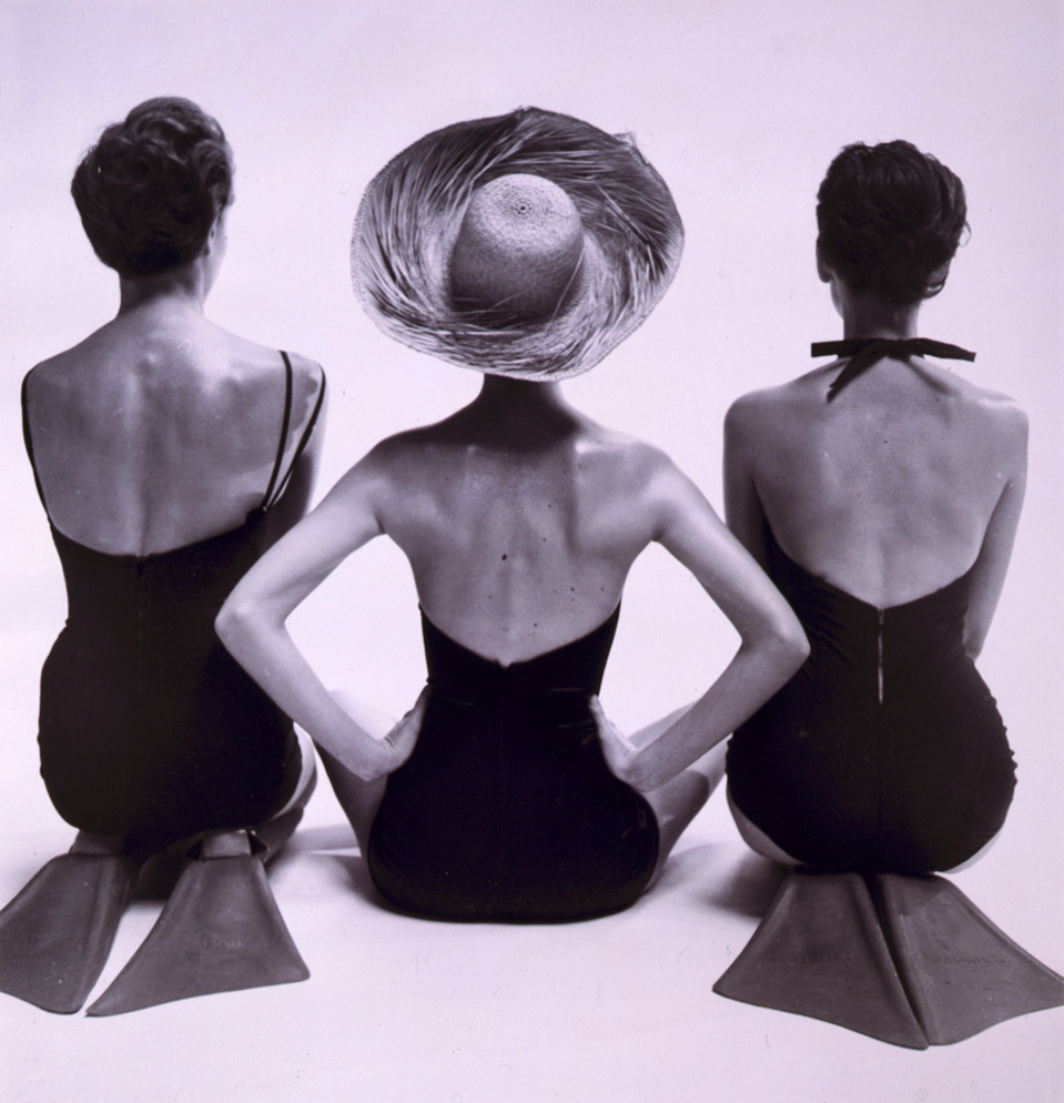 Back view of fashion models in swim suits, two kneeling wearing swim fins, and one seated. Photograph published in Harper's Bazaar, January 1950. |