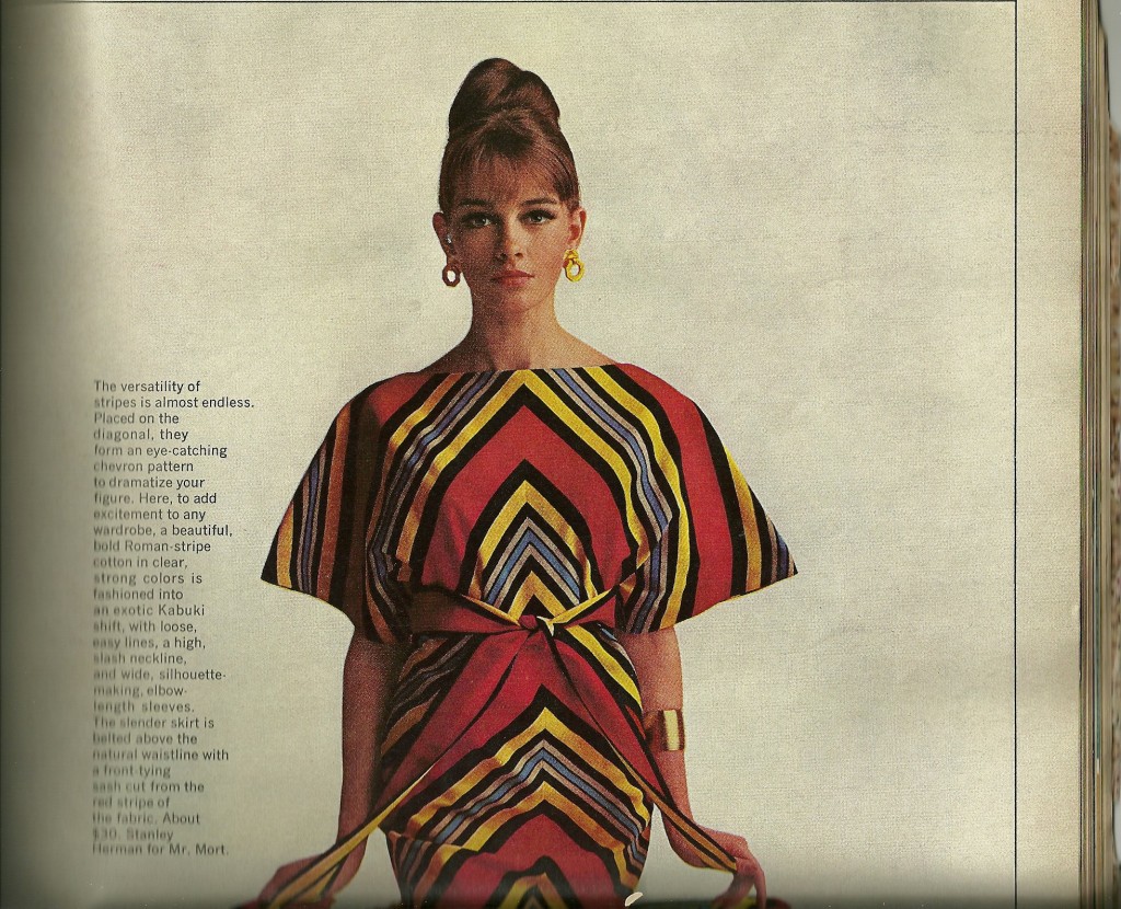 From the magazine: “The versatility of stripes is almost endless. Place on the diagonal, they for an eye-catching chevron pattern to dramatize your figure. Here to add excitement to any wardrobe, a beautiful bold Roman-stripe cotton in clear, strong colors is fashioned into an exotic Kabuki shift, with loose, easy lines, a high, slash neckline and wide, silhouette-making, elbow-length sleeves. The slender skirt is belted above the natural waistline with a front-tying sash cut from the red stripe of the fabric. About $30. Stanley Herman for Mr. Mort.”