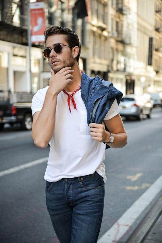 To achieve a hint of vintage Americana with your look, pair the jean jacket with a bandana. If you’re really feeling bold, pair your jean jacket with jean pants. When pairing two denims, make sure to choose two different washes to distinguish your separate pieces.