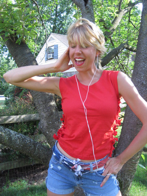 2 / Last summer I DIYEed my heart out with an oversize red tee, J.Crew bootcut jeans and these crazy awesome American flag spandex pants. The jeans were cut and distressed into shorts, the oversize top cut and tied at the sides into a slinky tank, and the pants cut into oh-so-many-things, like this decorative belt looped in my shorts.
