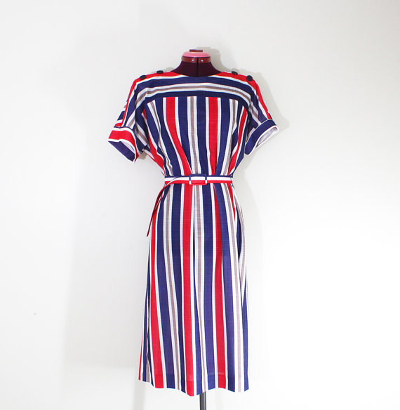 3 / A patriotic striped ’80s day dress — glam it up with black wedge pumps and a super chunky patent leather square buckle belt. Wear a headscarf for some rockabilly edge, if so desired!