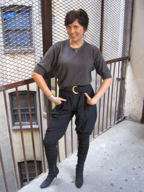 *How I made the tapered leg look work to benefit from the harem-pants-gone-rampant trend: Take any seemingly shapeless, boring, how-the-hell-could-this-ever-flatter-my-body pair of pants and pair it with some sexy, skin tight boots. Tuck tapered bottoms of pants into the skin tight fabric of boot. Allow top fabric to billow out. Add a solid color (black or navy is best for all body shapes) form-fighting shirt or layer below with a body suit. What do you get? A little bit of genie thanks to the harem pant, but thanks to the more flattering elements (boots, monochromatic coloring, form-fitting pieces) not all the outlandish bottle that comes with it.