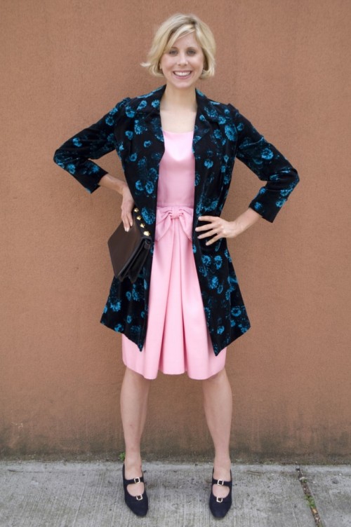 Look #5 was the most inspiring, because I love these little prom dresses, but I’m over 50 now and don’t want to look like a completely deranged bag lady lost in fantasies of her high school days. Aha!–just tone it down with a big-girl long jacket, and let the prom dress peek out!