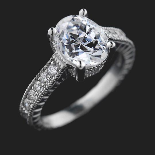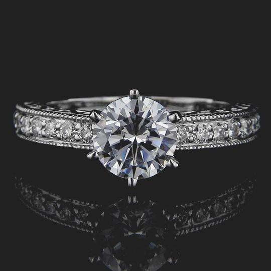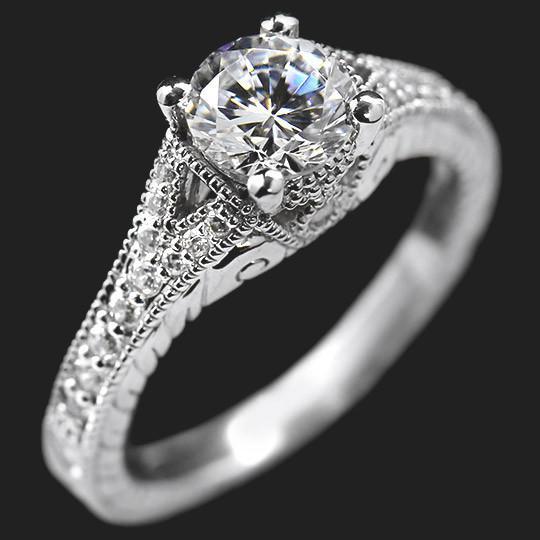 This lovely vintage engagement ring comes with a delicate scroll design and mill-grain details and is packaged in a luxury jewelry kit, to match its beautiful look. The Ali Antique Engagement Ring is designed for a round cut center stone and has a shank that is thicker and less delicate.