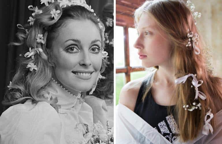 However, the element of this look that perhaps deserves the most credit is her incredible hair. Sharon chose to tie tiny ribbons all throughout her long blonde mane, along with a sprinkling of small flowers as well. The result: she looked just like a princess. This look couldn’t be more of its time, but it would still be stunning even today. For a modern take on Sharon’s perfect wedding hair, take a look at the models from Rodarte’s 2018 Spring Couture show in Paris: