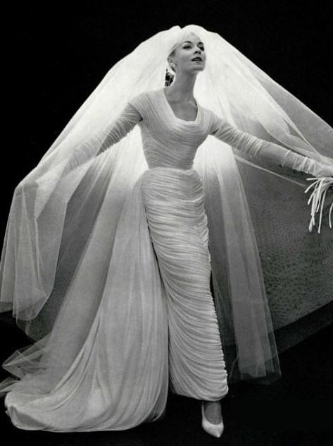 Quite a different bridal look from 1957 than Funny Face, this Nina Ricci draped silk jersey creation is nothing short of dreamy. The highly-texturized fabric, the simple scooped neckline, the flowing bustle, and the waltz-length veil all come together to create a terrifically gorgeous bridal look, both ethereal and incredibly chic—two things that usually don’t go together.