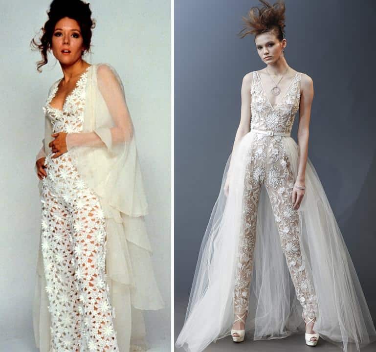 In the 1960s and 70s, Jane Birkin was the queen of effortless chic—and this bridal look from 1968 is no exception. Her no-fuss white crochet dress, with the simple accessories of a dainty necklace and a flower crown, is timelessly stylish. Adding to the tone of this look are her bare feet and everyday hair. A bohemian dream. The reason this look rarely gets mentioned is most likely because it’s unclear if it was meant to be a wedding dress. Whether Jane was actually getting married to Serge in this dress is unclear, and so it often gets ignored. Whatever the circumstances were, it still makes a delicious bridal look!