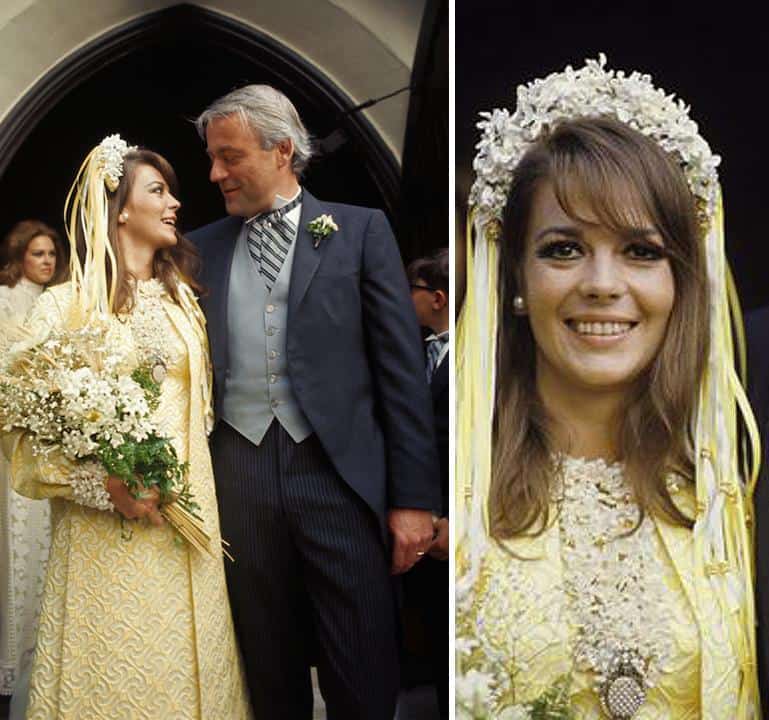 Years later in 1969 when Natalie married Richard Gregson, she looked equally incredible. This time, she went with a “yellow” theme and chose a yellow dress, a yellow headpiece, and a yellow floral bouquet. The dress is lovely, but the true underrated standout here is Natalie’s playful ribbon “veil”. The unique design caters to Natalie’s youth, but is also quite adult when paired with a conservative dress like Natalie’s. If this bridal ribbon headband were widely available today, it would be very in demand.