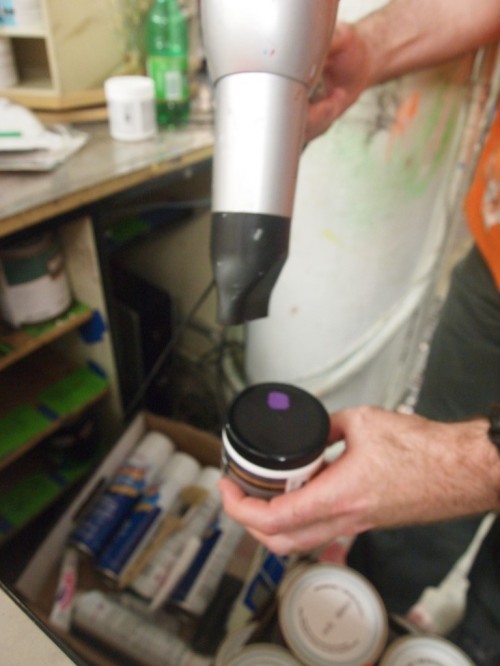Peter hooked us up with two samples [see him drying the lids shut below] so that we could “test” the colors on the wall without actually having to paint the wall itself.