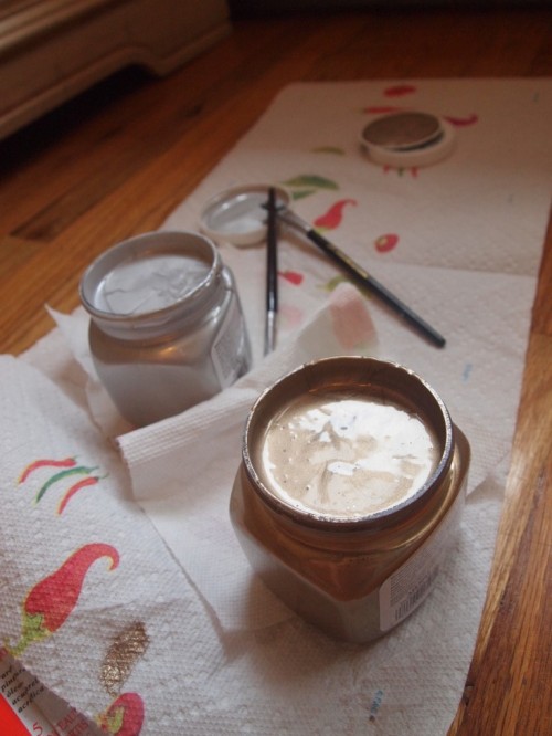 Using a mixture of the silver & “vintage” gold colors, I painted each “ripple” of the mirror [I know there is a more appropriate term. If anyone knows how to describe, please comment!] a corresponding color. So, one ripple would be gold, the next silver, and so on and so forth.