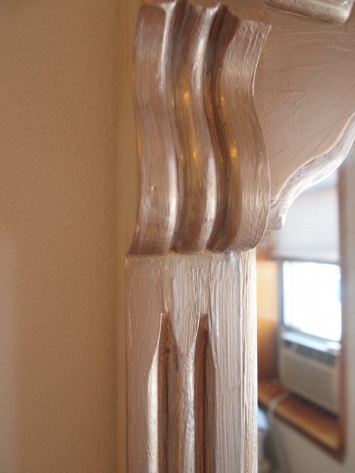 Using a few tiny paintbrushes, I worked some artistic magic into the crevices of this vanity mirror …
