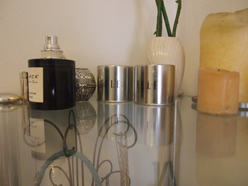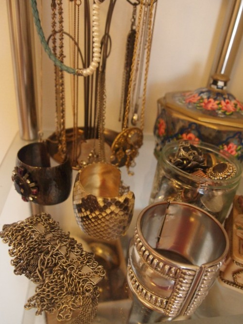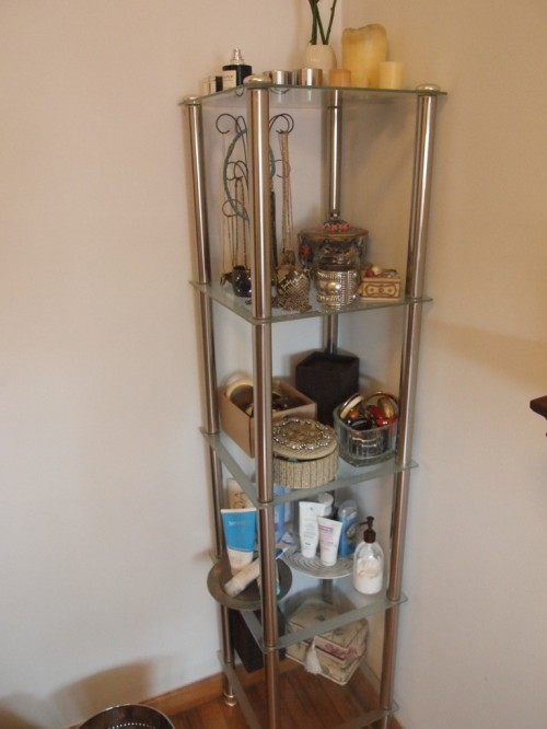 Sabrina has the most gorgeous corner hutch/shelfing hutch made from metal and glass. She uses it to organize a mix of jewelry and lotion/everyday beauty products that she likes to keep within reach.