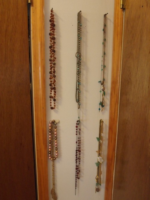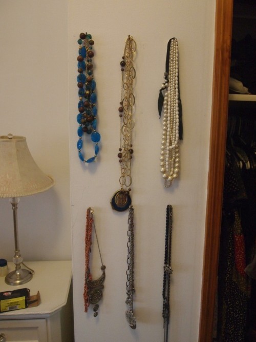 We made Sabrina’s necklace display into two rows of three nails each on either side of her closet door. The symmetry is attractive, and the organization? Absolutely necessary!