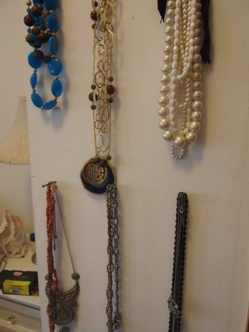 The easiest DIY method of showcasing your necklaces and keeping them organized [read: tangle free!] is by creating a display wall of them using the simple tools of a hammer and some nails.