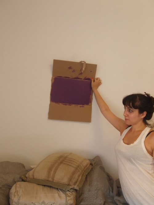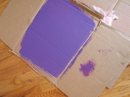 So to “test” the color on the wall at all hours of the day without actually painting the wall, I grabbed some cardboard off the street [in front of a grocery store — how appropriate!] and painted the cardboard slabs each color to “hold” against the wall and give a hard view from afar.