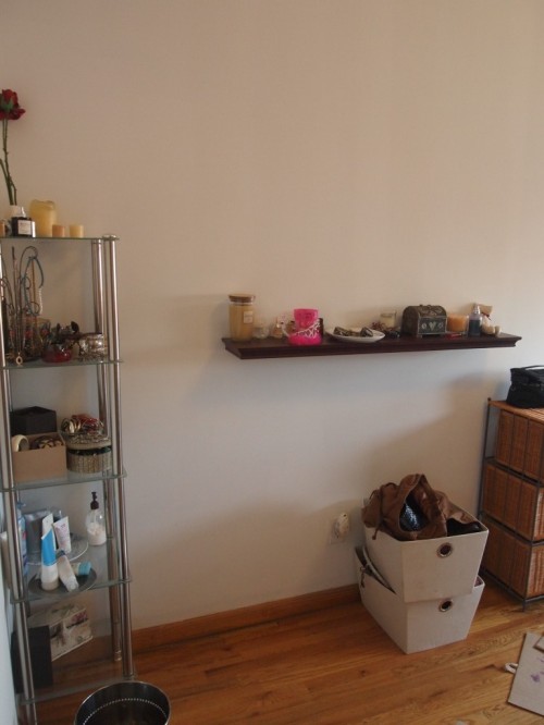 We re-arranged the focus of each shelf — placing the beauty products on the bottom shelves, and organizing each shelf to hold a different “type” of jewelry — say bracelets on one shelf, short necklaces on another, etc.