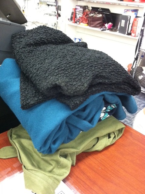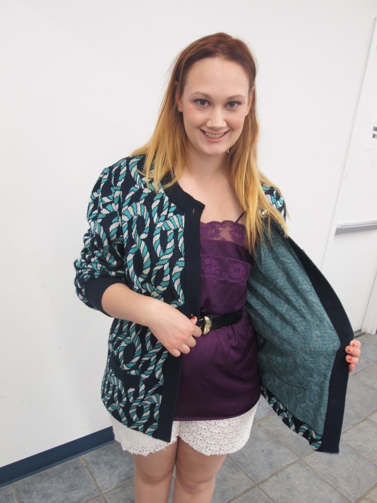 3 / $28.76 with her student discount of 10% off!! Stacey Kay grabbed the Grandpa sweater & army/navy jacket seen above, plus the turquoise oversize blazer shown in her first pic and a bonus vintage ’80s black lace coverup not shown earlier. THRIFT SCORE!