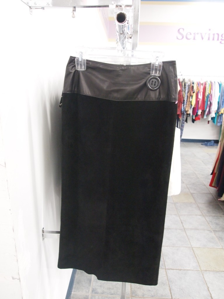 3 -4 / Another interesting take on a leather skirt. This one is cut more like a “witchy, granny look.” But the fit is surprisingly sexy when worn with great heels and a tucked in, fitted top.  I love how the waist band is made from suede and accented with one simple oversize button. It stands out against the streamlined effect of the black leather.