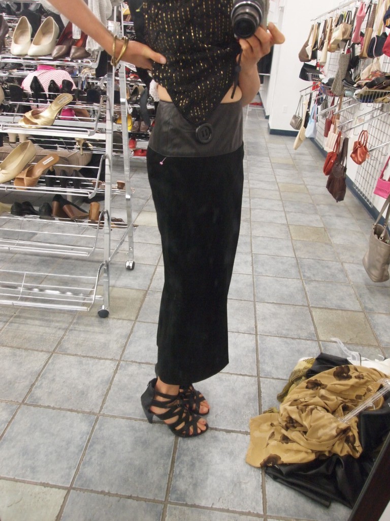 I was attracted to this skirt not only because of its brown color, but it’s vintage wash. Note how this isn’t actually a solid brown, but has varied hues. Also, it’s a midi length skirt on me [being 5′ 9″, I get lucky] which is totally on trend for fall. I may need to invest in this skirt for Fashion Week coming up right around the corner! It was $19.99 — what do you think thrift lovers? Should I go back and get it?