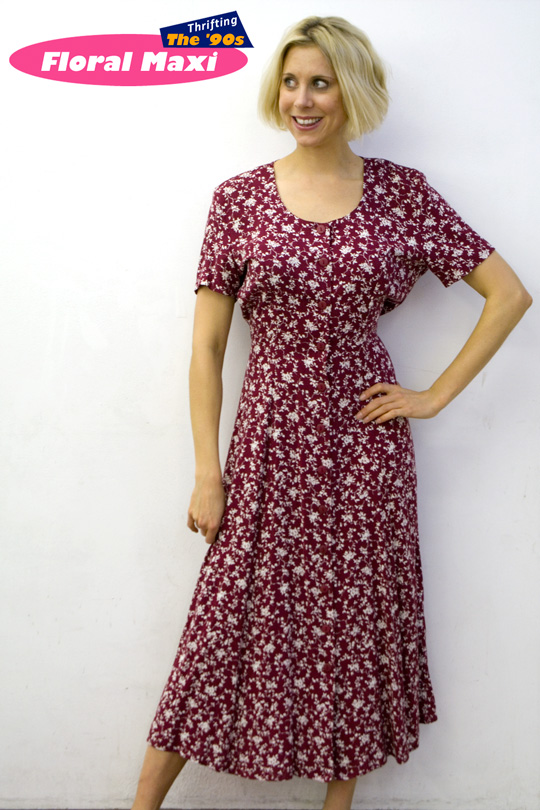 THE TREND: Floral maxi dresses were a ’70s flower child revival with a ’90s fashion spin. Rather than made from a sweaty ’70s polyester and printed with oversized florals in bright bolds, the ’90s maxi was a breezy rayon-cotton blend of ditzy florals (more like a ’30s feedsack dress print) and commonly buttoned from top to bottom. In my thrifting travels, I can’t remember ever seeing a long sleeve ’90s maxi, so it’s safe to conclude short sleeve styles were the most popular and most produced for the era.
