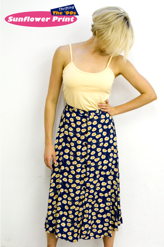 THE TREND: The sunflower design trend was one of many print trends to come out of the ’90s, along with daisy floral, ’60s inspired colorblock and dirty grunge plaid. Sweet and innocent seeming, the sunflower print was fitting for the grunge girl who wanted to pair it with a tattered long sleeve denim shirt and utilitarian combat boots for an ironically rebellious fashion statement. But sunflowers were marketed to the mainstream market too, and designers tacked them onto just about every item of clothing imaginable from maxi skirts (like the one I thrifted above) to jumpers, tops, shorts, bags, accessories and hats (with oversized sunflower appliques a la ’90s fashion icon Blossom).